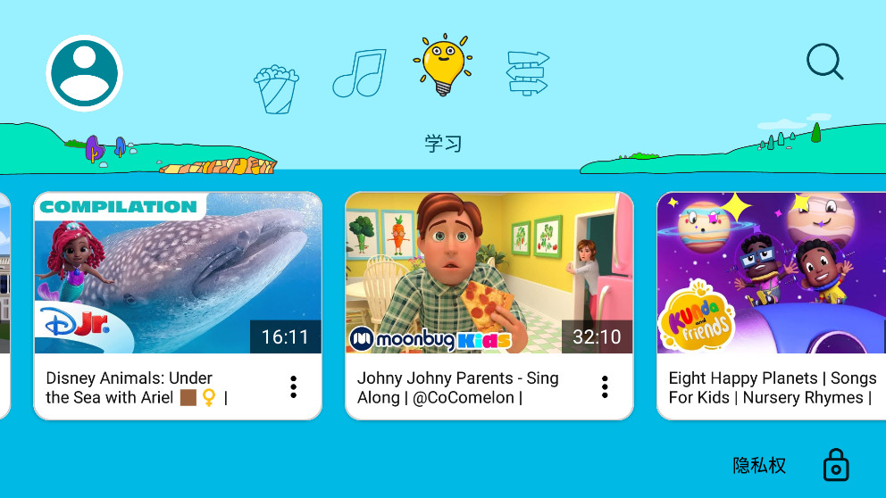 如果您想亲自挑选您已批准孩子观看的视频、频道和/或收藏集,请选择“仅批准的内容”模式。在这种模式下,孩子们将无法搜索视频。专为4岁及以下儿童设计的“学前班”模式可以策划促进创造力、趣味性、学习和探索的视频。“年轻”模式允许5-8岁的孩子探索他们对各种主题的兴趣,包括歌曲、卡通和手工艺品。而我们的“大龄”模式让9岁及以上的孩子有机会搜索和探索其他内容,例如儿童流行音乐和游戏视频。