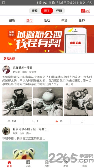 1、疯狂美术:内置评画、评测、机构、推送、直播、课程、好友、圈子八大系统和名师、频道、资讯、报考四大板块,海量信息任由你取。