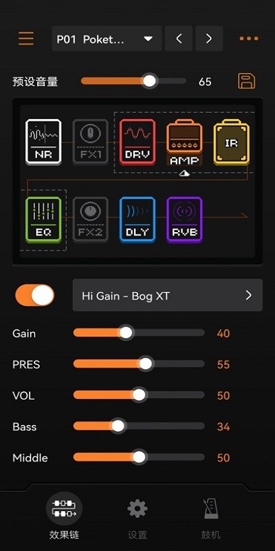 手机蓝牙连接,直接可以操作多大九个效果器链,包括噪声门,od过载类效果,箱体模拟,周边类效果,以及空间类效果,delay,reverb等等,都可以一键调节。