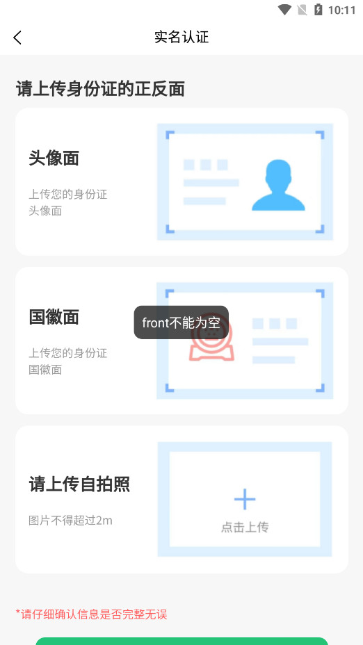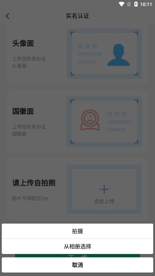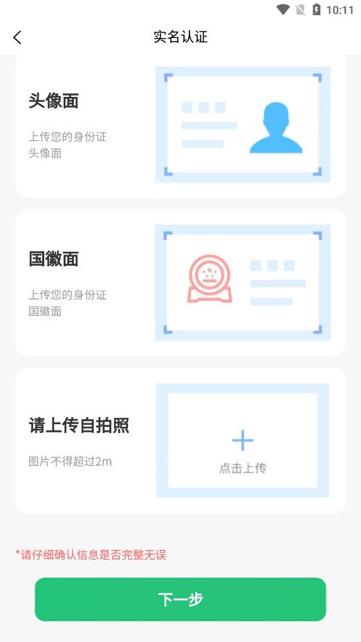 3、上传个人身份证的头像面、国徽面以及自拍照,仔细确认信息是否完整无误,之后点选【下一步】完整注册和登录。
