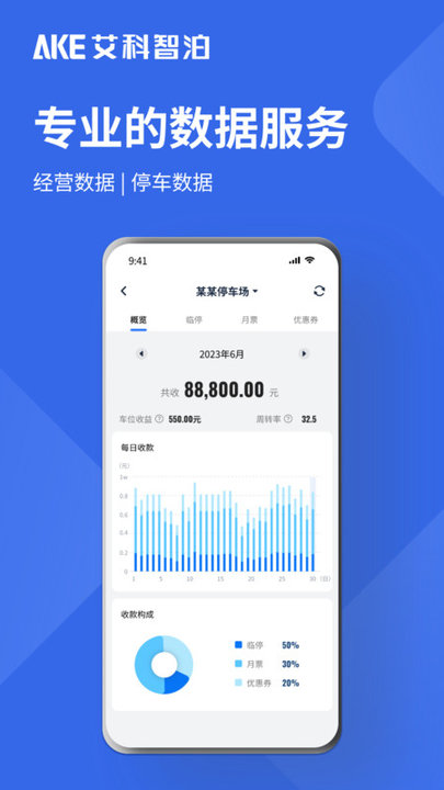 对于车场运营方来说,车场数据清晰明了,有据可依是最大需求。艾联客APP可自动生成并实时推送可视化数据分析图表,车场运营方可随时随地查看车场经营数据、停车数据,通过车场实况及时调整运营决策和管理规划,促进车场后续运营。