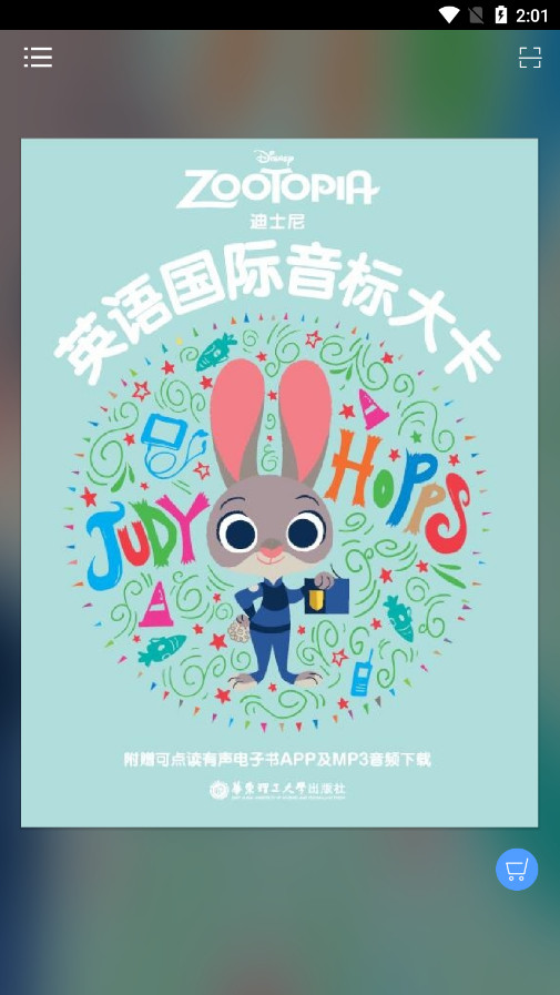 1、打开英语国际音标入门迪士尼英语App,看到的是它的配套学习资料介绍,这里如果要购买的话,点选蓝色购物车图标,如果学习的话直接选择封面进入。