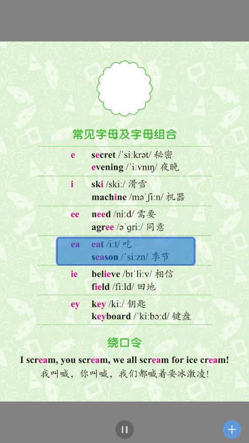 我们在给孩子启蒙英语的时候,优先亲子共读和听儿歌,尽量给孩子创造一个沉浸式的家庭学习环境,两岁以后引入电子屏幕,再间歇安排英语国际音标入门App的学习比较合适。