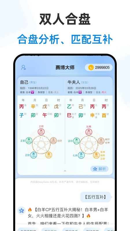 赛博大师官方软件融入了时下火热的ai技术,支持进行排盘,还能参与各种测试,心理、性格、爱情、事业等全面支持,还能进行ai对话,查星座运势,咨询心中的各种疑惑,还能在这里记录自己的生活日常,数据加密,隐私性强!