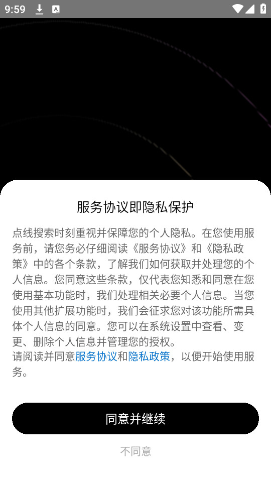 下载安装并打开点线搜索app,点击同意并继续,同意隐私协议