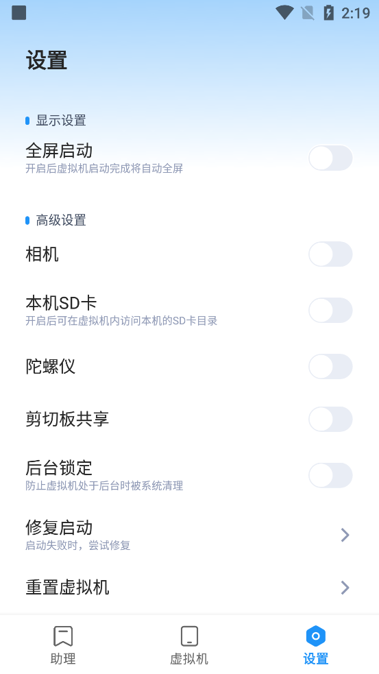 通过“设置”调整虚拟机性能参数(如CPU/内存分配)、手势操作等,优化运行效率。
