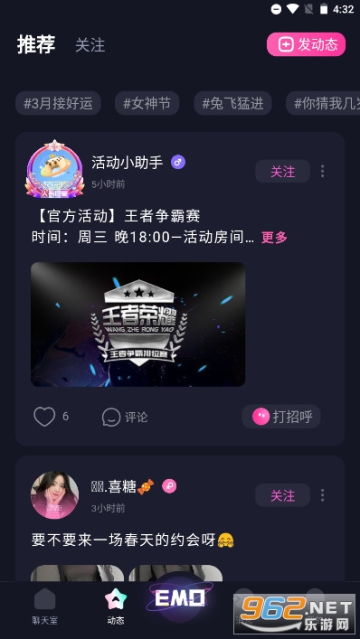 3、动态分享,直接分享你的动态,动态记录你的生活,传递正能量,不用担心奇怪的眼睛!