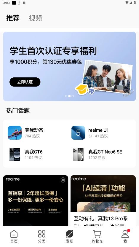往下滑动屏幕,找到商城专享福利-学生认证专享,点击立即认证