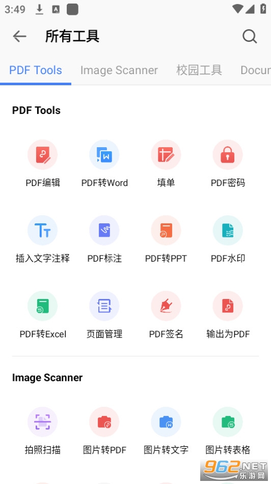2、打开WPS Office应用,在主界面上可以看到WPS Office提供了“文档”、“表格”、“演示”、“PDF”等不同类型的文档编辑应用程序。选择您要使用的应用程序。