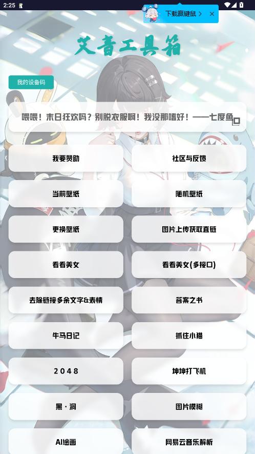 「艾音壁纸工具」是一款集创意生成、实用工具与趣味游戏于一体的全能型数字生活助手。不仅提供海量高清壁纸库,更内置AI绘画、链接净化、答案之书等20+黑科技模块,覆盖日常娱乐、办公效率、技术开发等多场景需求。从恶搞神器「牛马日记」到极客向的APK提取工具,这里既有杀时间的魔性小游戏,也有程序员必备的代码工具,重新定义「实用主义」的边界。