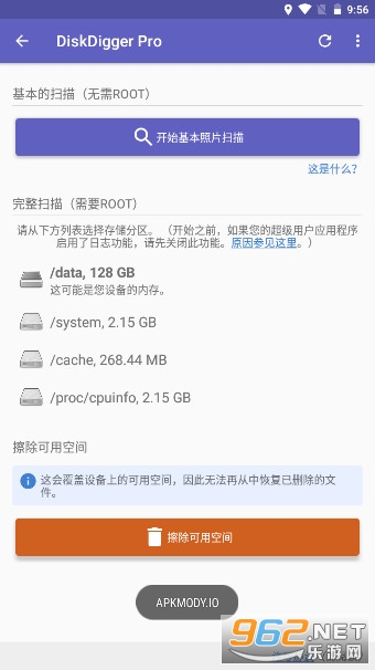 在Android上使用DiskDigger非常简单。启动应用程序后,它将显示两个选项:“基本扫描”和“完全扫描”。“完整”扫描功能仅在有root权限的设备上可用,而无论您的设备是否有root权限,都可以使用“基本”功能。