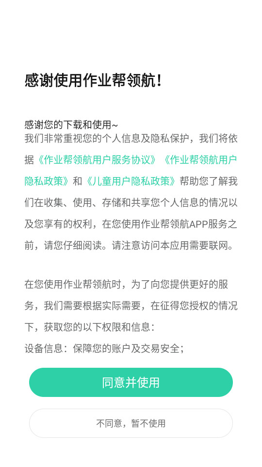 下载安装并打开作业帮领航app,点击同意并使用