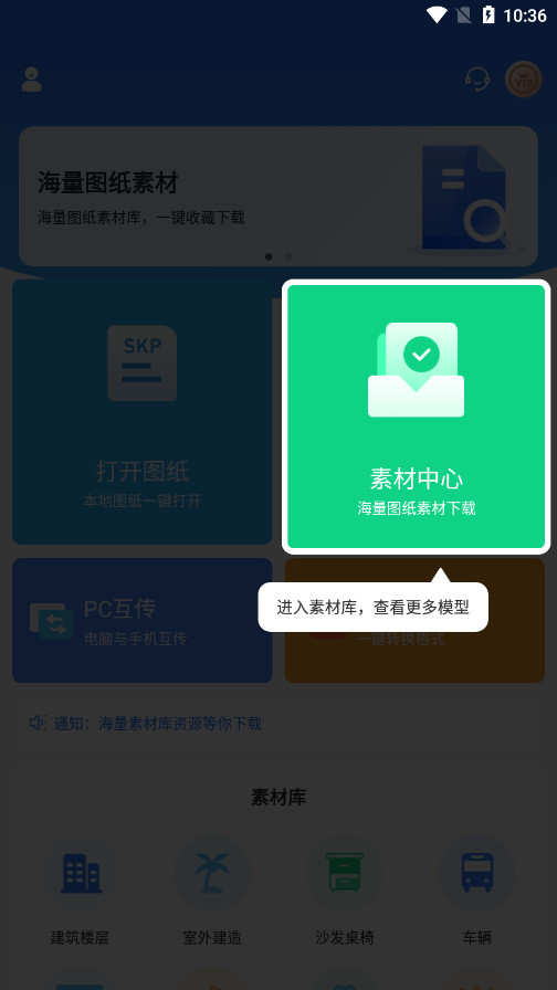 草图大师SKP素材库模块为用户提供了丰富的模型素材下载功能,素材分类齐全,既能直接下载使用,又能开拓视野,同步支持多种主流格式软件,解析浏览多种格式图纸,还支持将cdr图纸转换为PDF。