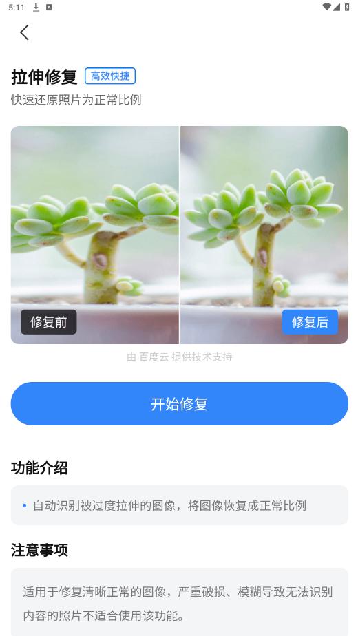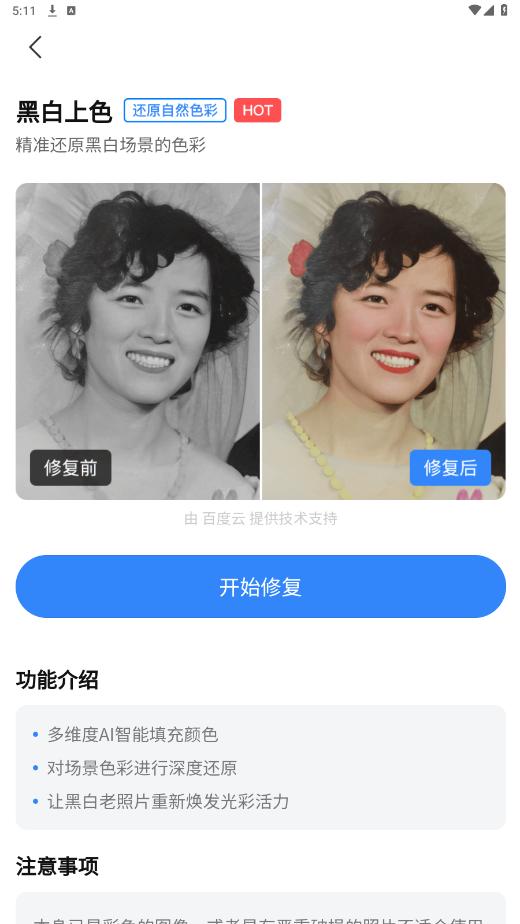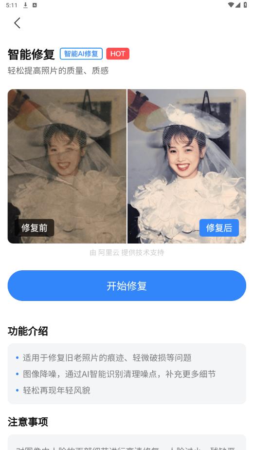 打开旧照高清修复app,点击选择所需功能,比如智能修复