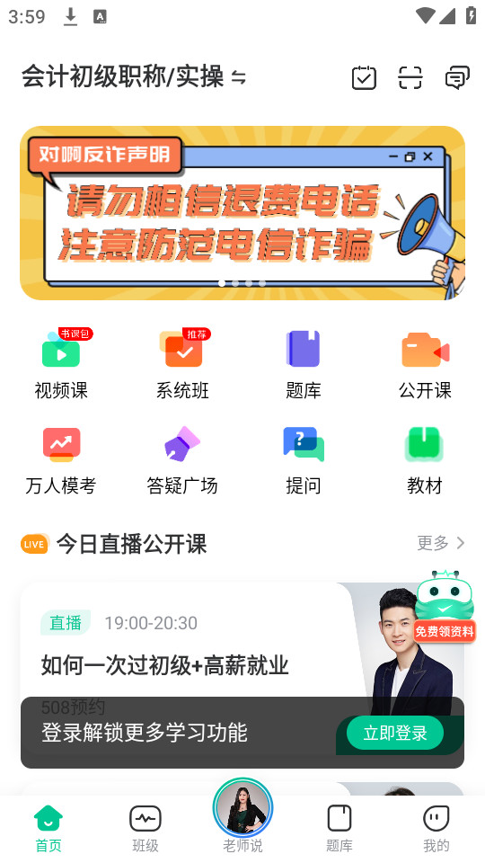 3.免费直播公开课:在线免费直播,必考知识点,考试须知,历年真题讲解,手机听课兼刷题,互动教学,个性化辅导,资深教师带你速效提分!