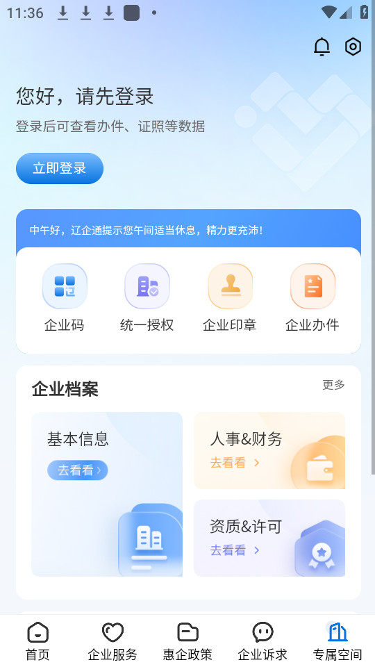 面向企业用户设计开发的政务服务APP。围绕企业全生命周期,为企业提供开公司、办业务、找政策、提诉求、查信用、招人才、拓商机等特色服务的方式,设置为“首页”“营商服务”“营商政策”“营商诉求”“企业专属”五大频道。面向企业法人实现在移动端办事的统一身份认证,提供企业开办、一件事办理等服务;面向企业经办人员,依托授权体系,以授权根据不同角色经办人员在线办理企业相关业务。