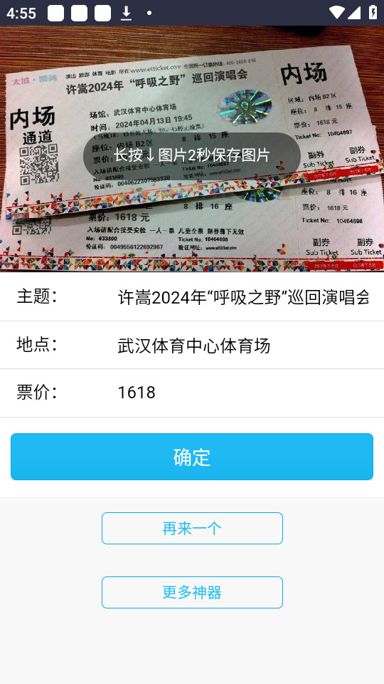 保存与分享:用户可以将生成的门票图片保存到手机相册,并通过社交媒体等平台分享给朋友,展示自己的创意和喜好。