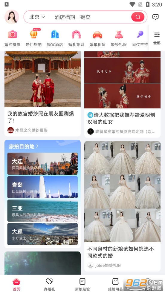 婚礼纪APP是新娘们信赖的结婚筹备一站式服务平台,提供找婚庆、婚礼策划、购买婚品、婚纱摄影拍婚纱照、租婚车、婚宴酒店预订、制作结婚请柬以及新娘说结婚攻略等结婚一条龙服务的婚礼筹备网站,精选国内各大平台优质商家,携匠心团队制作,认真对待你的婚礼 !