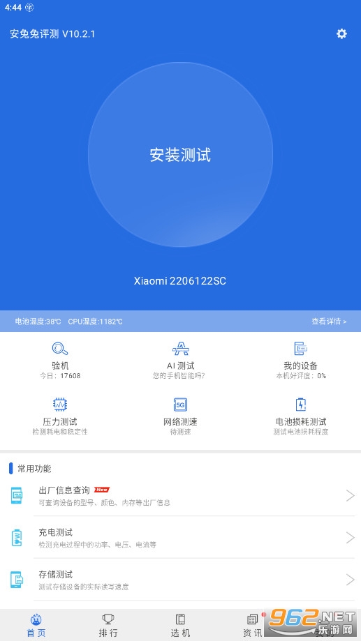 《安兔兔评测》(AnTuTu Benchmark)是一款专业实用的手机评测软件,软件中你可以对你的手机进行一系列的测试,一键显示手机硬件配置,真伪查询,实时监控手机温度,手机资讯等多种实用功能,软件的功能众多专业,还在等什么呢?赶快下载体验吧!