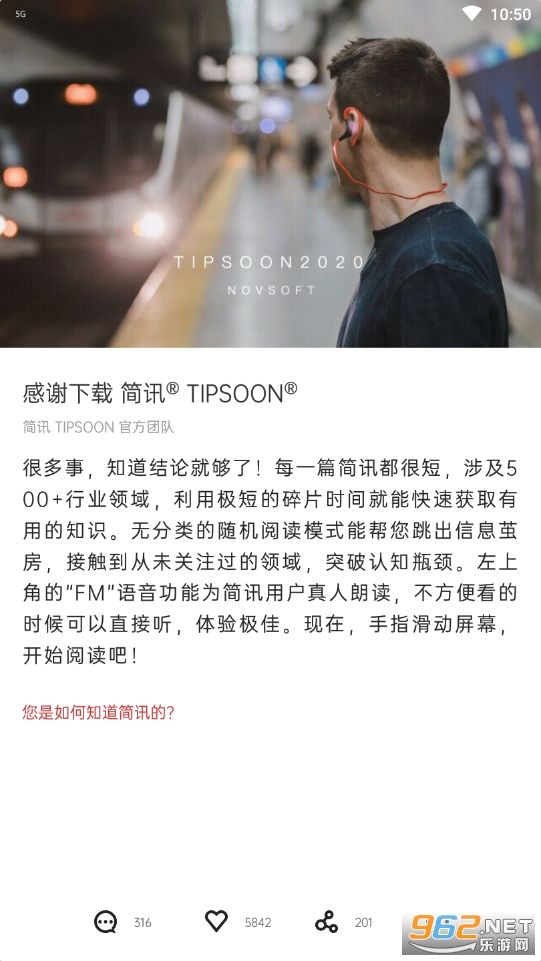 简讯「TIPSOON」是一款主张利用极短的碎片时间涉猎全行业领域的浅阅读产品。无分类+随机阅读的模式是简讯的核心体验,可以让阅读者跳出已经习惯关注的领域,接触到兴趣以外有用的知识以及有趣的内容,从而突破认知瓶颈。