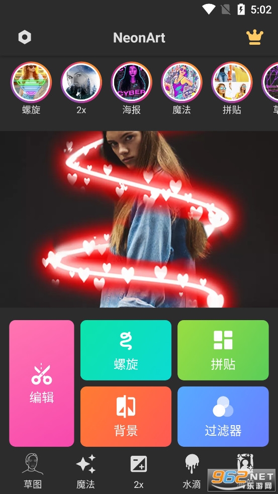 NeonArt 专业图片处理软件&修图软件, 具有数十种霓虹灯效果和霓虹灯螺旋,为您提供最佳的照片编辑体验。霓虹灯贴纸和霓虹灯背景类型将为您带来惊人的照片。为美观的艺术设计准备好令人敬畏的霓虹灯翅膀。 NeonArt 图片编辑器 绝对是拥有所需所有图片编辑工具的最佳照片编辑应用程序!