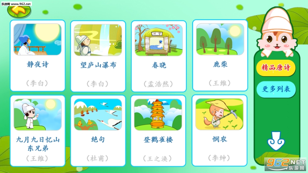 宝宝唐诗三百首精选儿童容易模仿学习的经典唐诗,通过精美的动画和好听的声音激发宝宝的兴趣,让您的宝宝快乐学唐诗。