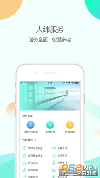 《大纬康养app》是一款非常好用国民养老app,专注于健康管理和养生服务的手机应用。该应用提供了丰富的健康资讯、养生知识和在线咨询服务,帮助用户了解自己的健康状况,并提供个性化的养生建议和解决方案。用户可以轻松浏览各种健康资讯和养生知识,随时向专家咨询问题,并方便地管理自己的健康数据。通过它,用户可以方便地进行健康监测、获得个性化的健康建议和享受康养服务。