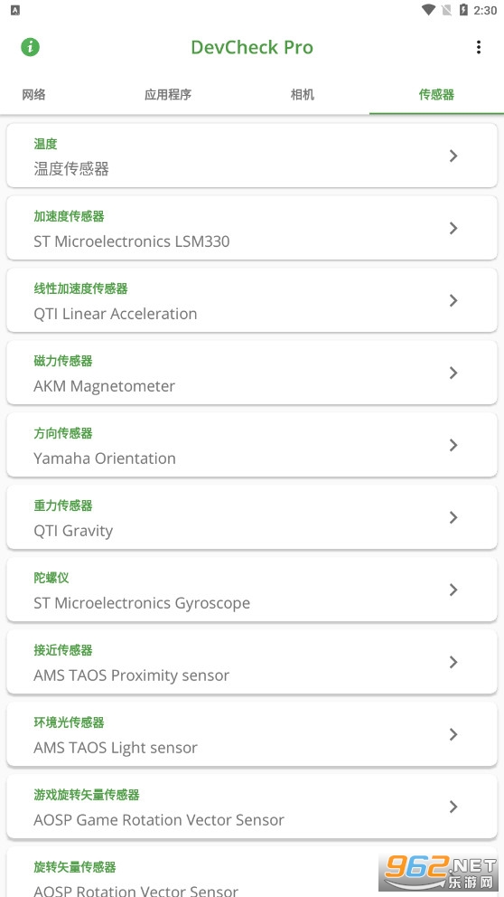 传感器:的设备上的所有传感器,包括类型,制造商,电力和分辨率的列表;