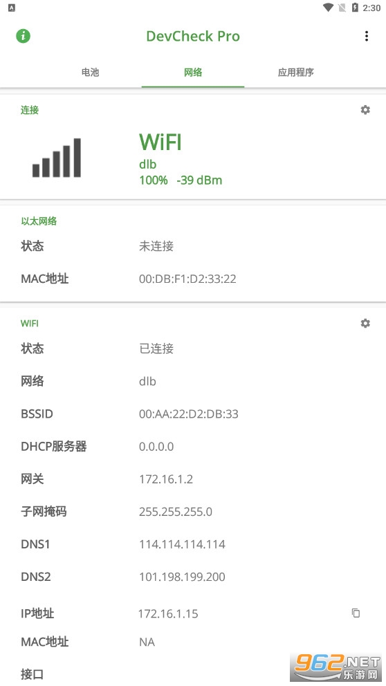 网络:显示有关WiFi和移动/蜂窝连接,其中包括IP地址(IPv4和IPv6),连接信息,运营商,手机号码,电话和网络类型信息;