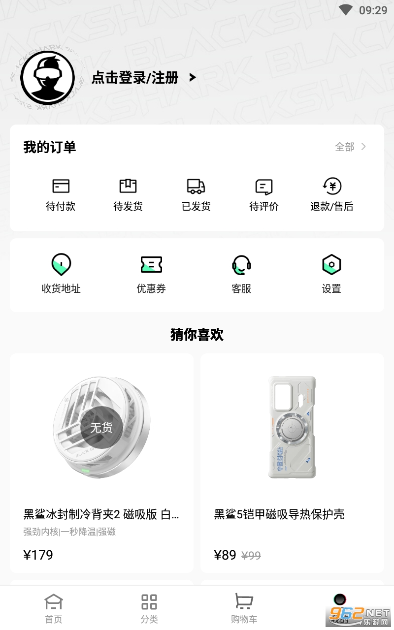1、下载安装黑鲨商城app官方版后,打卡软件进入【首页】功能,我们就能看到一些热门的商品分类,如新品配件、爆款、手机等。