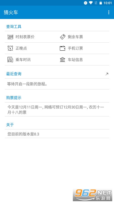 猜火车提供火车信息查询服务,与铁道部官网同步,支持最新数据!包括火车余票,售票点,时刻表,停靠车站,票价、正晚点等各种火车信息查询功能。界面美观实用,支持包括CMWAP在内的所有网络,且流量少。
