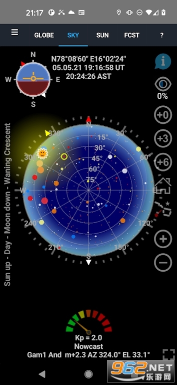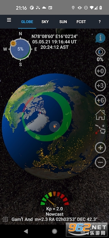 极光预报 3D 是一种从地球上任何位置追踪极光在天空中位置的工具。它以 3D 方式渲染地球,旋转和缩放尽在您的指尖。您可以选择位置并创建自己的地面站列表。太阳近乎实时地更新,照亮了地球。短期预报最多可提前 6 小时,而长期预报最多可提前 3 天。当应用程序处于活动状态并连接到互联网时,它们会更新。随附的极光指南针可显示当您从所在位置仰视天空时极光椭圆形 、月亮和太阳的位置。指南针中还可以显示月球的相位和年龄。通过缩小 3D 视图端口,卫星、恒星和行星会出现在它们围绕太阳的轨道中。