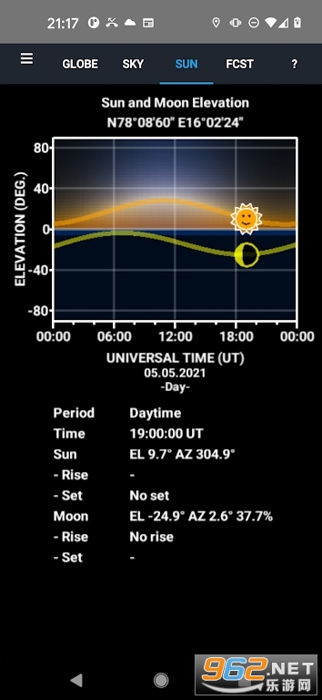 太阳和月亮的每日海拔高度图以及上升和落下时间。