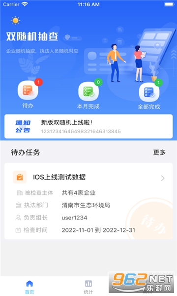 本月完成、全部完成的功能;任务能够显示详细信息,被检查主体、执法部门、负责组长、检查时间等,方便检查;在统计页面还有企业抽查趋势、抽查结果上报率等数据信息。