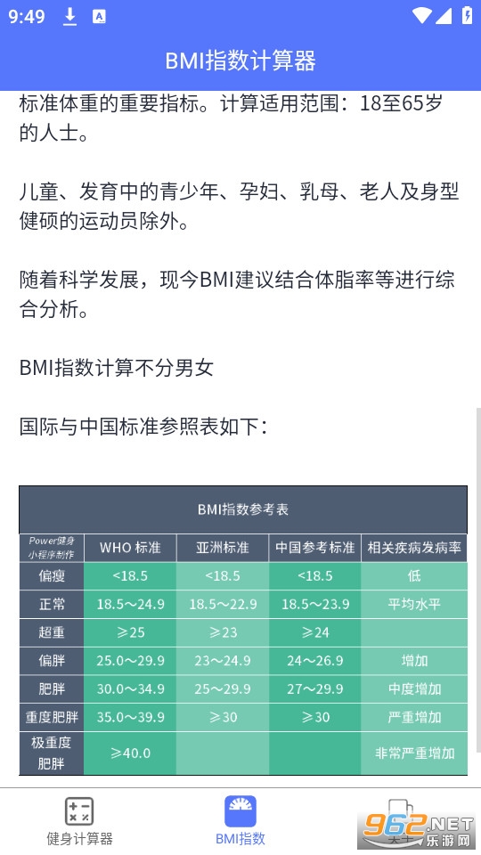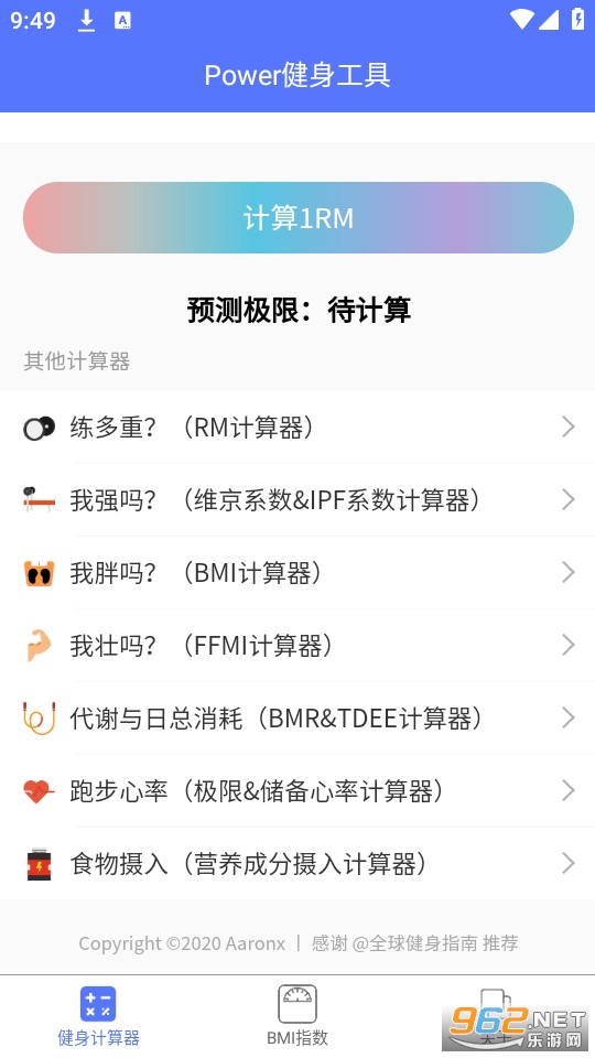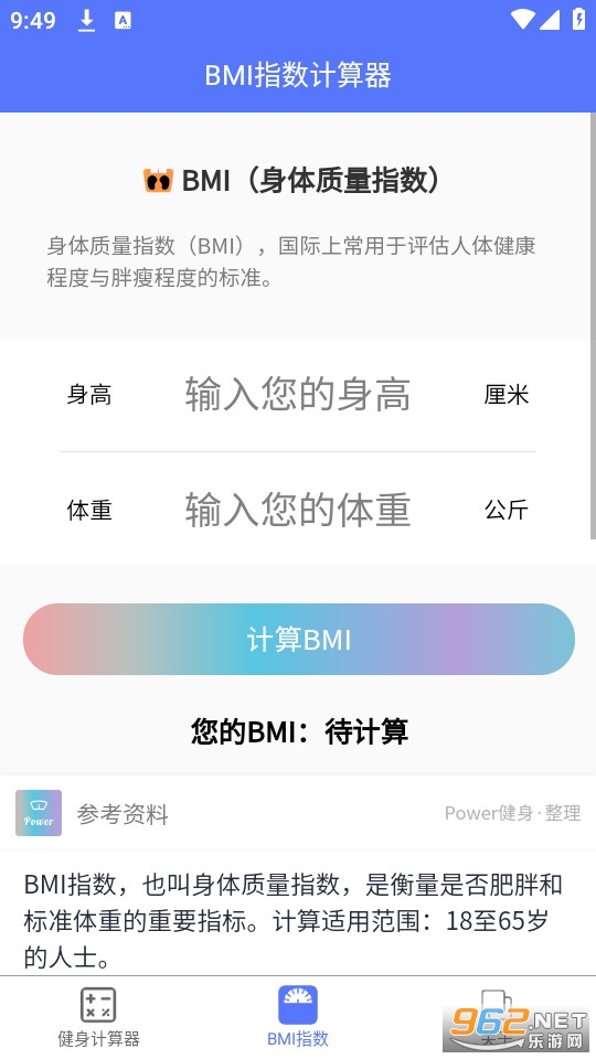 1、Power健身是专业的健身工具,提供BMI计算、力量举训练重量计算、肌肉比计算、代谢计算、饮食计算等。