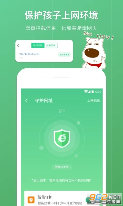 网址拦截: 应用拥有数亿条黄赌毒网址,可以一键智能拦截,确保孩子不会接触到不适宜的网站内容。
