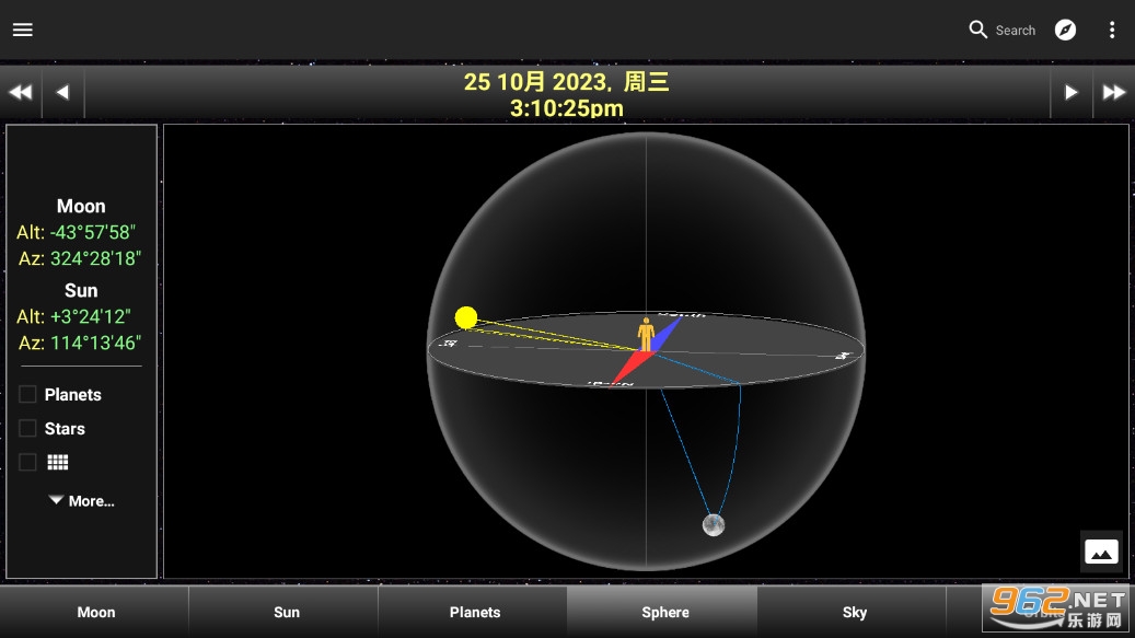 互动天空球:应用内有一个互动的天空球,用户可以在上面看到月亮、太阳和所有主要行星的实时位置,增强了观测的交互性。