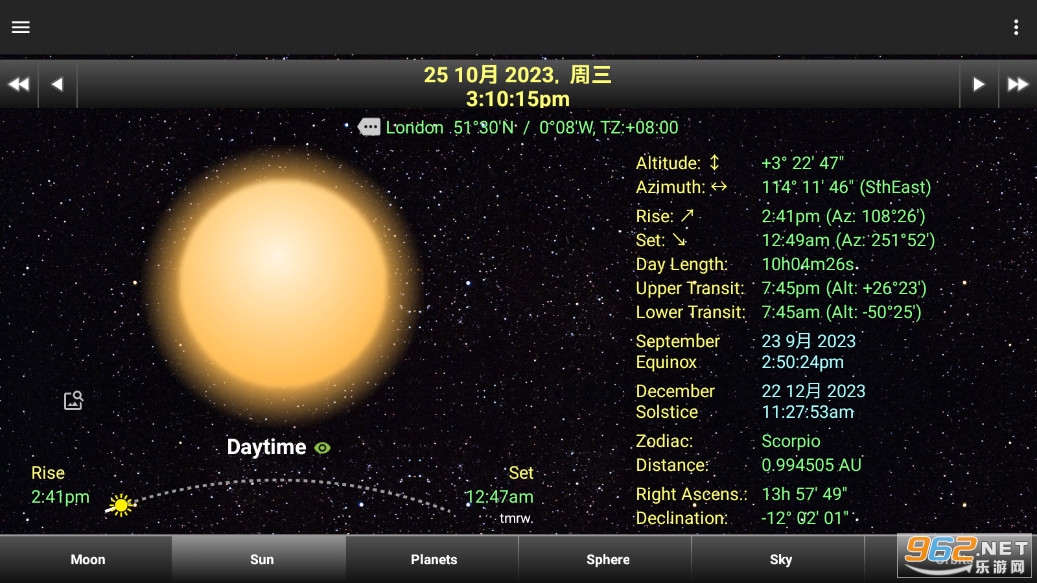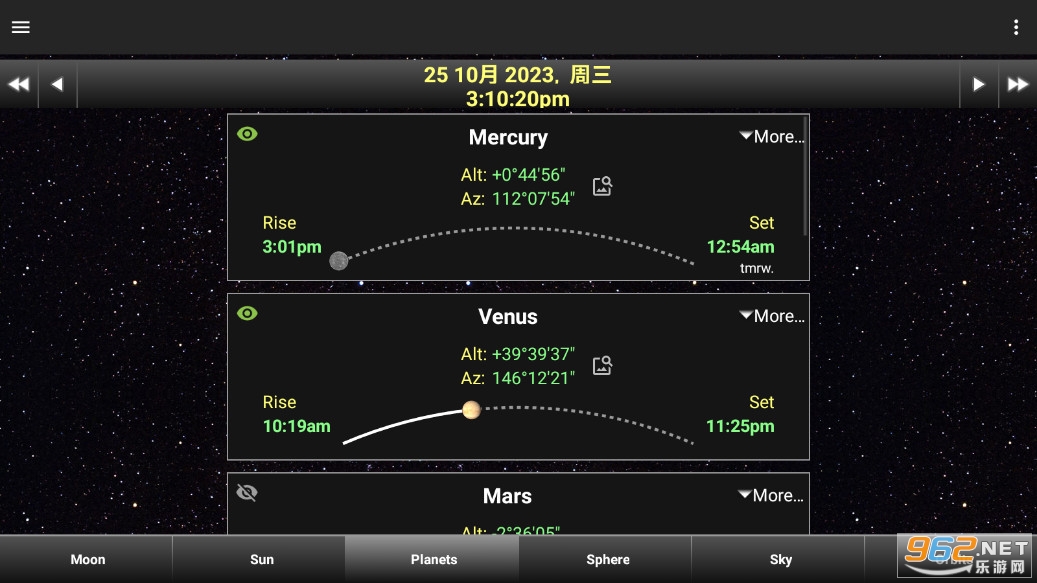 全面的信息:用户可以获得关于月球、太阳和所有主要行星的广泛信息,包括它们的位置、高度、方位角等,以及一些重要的日期和时间。