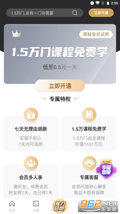 打开能力天空app客户端,进入主页后可快速浏览平台分类一目了然,搜索一键触达想要的内容,导航栏精品课程、直播、会员、秒杀专区、热门类目等多个频道任您选择!进入个人中心方便用户找到自己所学课程、已收藏课程,已报直播课、面授等,比网站使用更加清晰方便。