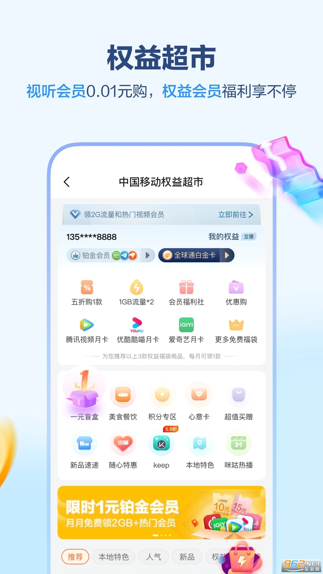 话费查缴、余额查询、套餐办理、电子发票、亲密付、中国移动云盘、全网资费查询、在线客服等功能,24小时随时随地贴心服务!