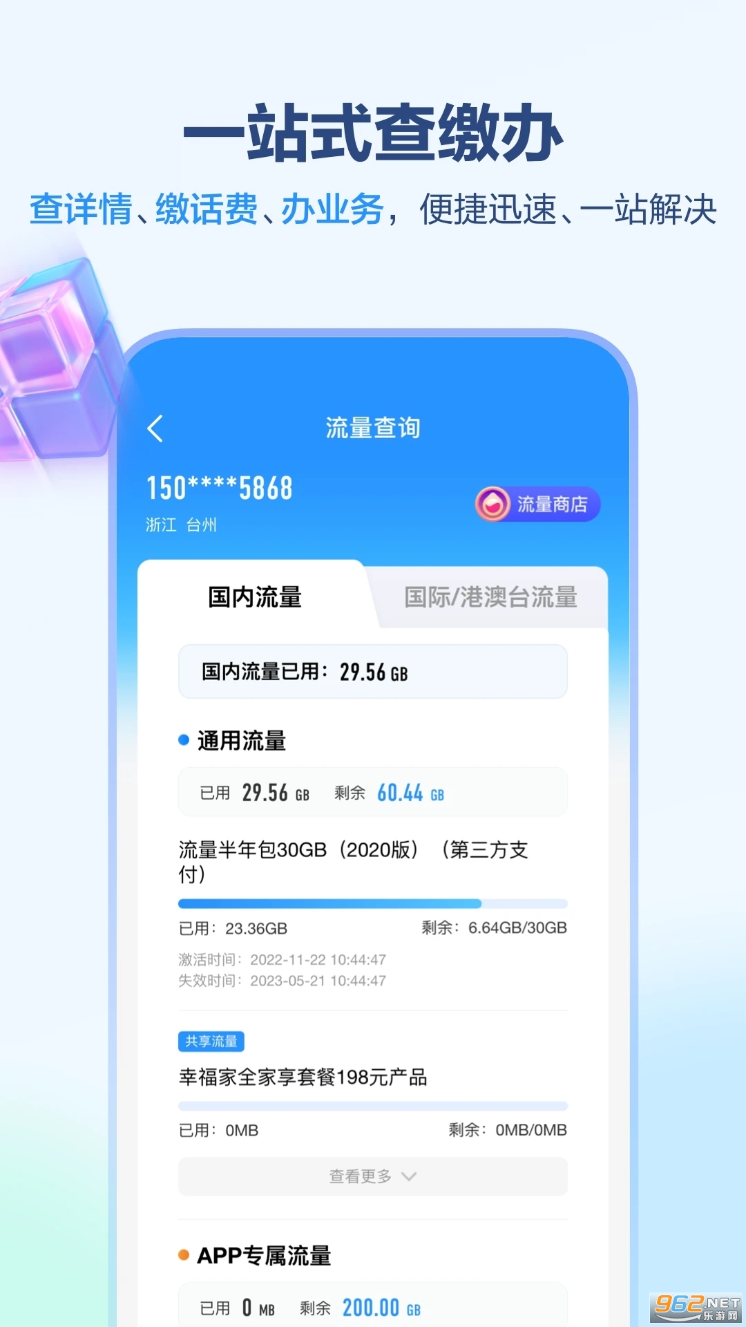 全方位支持实时话费、历史账单、积分余额、套餐余量、已订业务等信息查询,随时随地准确清晰。