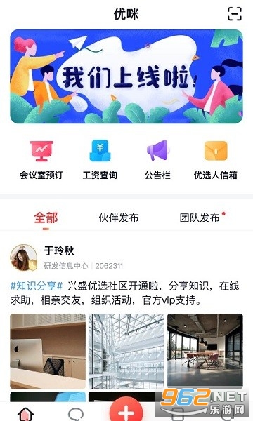 2、开设社区、公告、会议室预定、工作台等板块;