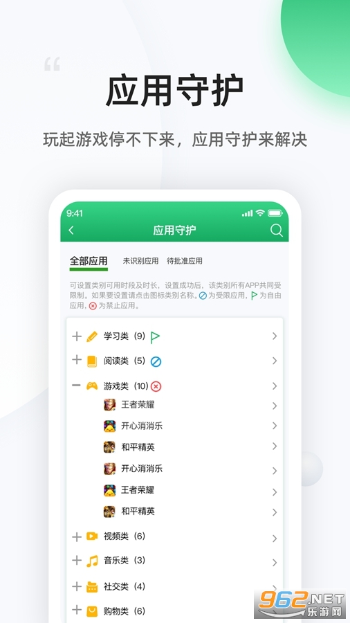 对孩子手机APP进行智能分类管理,系统对十一个类别进行分类管理,分为自由应用、禁用应用、受限应用三种状态,更有针对性的对APP进行细化管控。