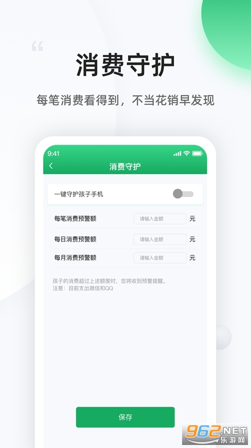 通过了解孩子日常消费情况,帮助孩子制定计划 让孩子有计划的、理性的去消费、养成良好的消费习惯 设定消费限额,实现游戏充值金额限制、打赏金额限制等 开启拦截功能后,超出金额可阻止支付