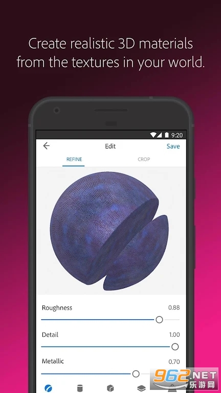 直接从相机生成逼真的 PBR 材料以用于 3D 设计。修改您的材料以获得更多纹理或混合边缘以在您的 3D 对象上无缝重复平铺。