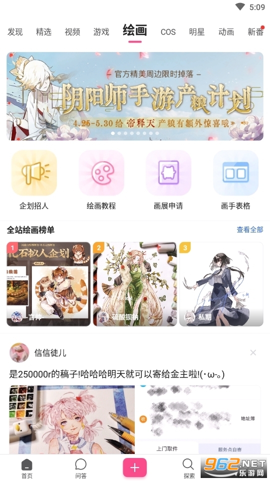 浏览绘画/写作/COS等圈子的热门榜单,围观人气作品;