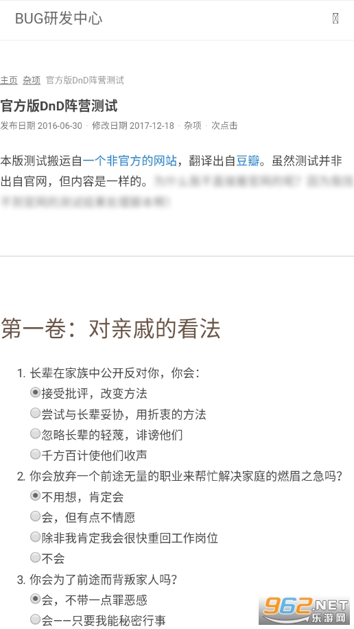 《官方版dnd阵营测试》是最近很多人玩的一款趣味测试软件,根据《龙与地下城》游戏中九宫格阵营将人的性格划分成了守序善良,中立善良,混乱善良,守序中立,绝对中立,混乱中立,守序邪恶,中立邪恶,混乱邪恶九个不同的阵营,每个阵营都有各自的性格特征,你只需要回答问题就可以看看你属于这九个阵营中的哪一个!
