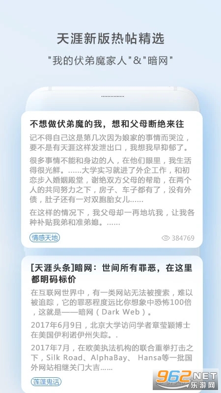 《天涯社区app官方版》是海南天涯社区网络科技股份有限公司推出的一款经典的内容创作和知识分享社交平台,从1999年推出到现在受到众多朋友的喜爱,注册用户达一亿多,朋友们可以在天涯社区谈天说地,分享自己的快乐、悲伤等等。