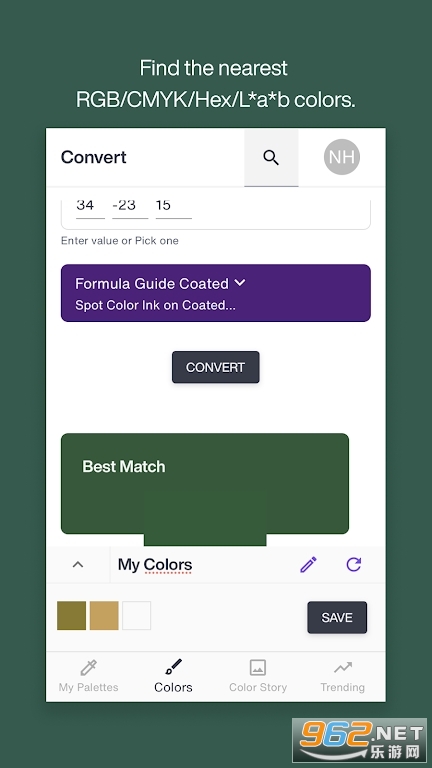 &8226;转换–查找与Pantone颜色最接近的RGB/CMYK/Hexx/L*a*b*颜色等价物,或在不同库中的Pantone颜色之间进行转换。
