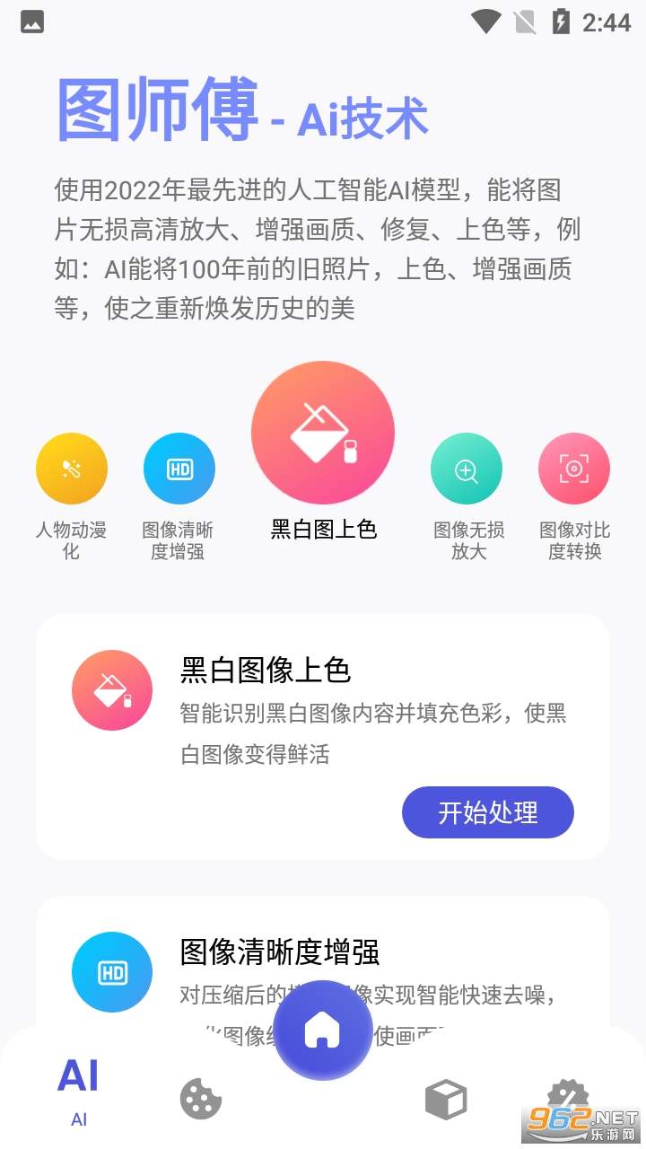 AI技术,拥有黑白照上色、图片无损放大、图像对比度转换、人物动漫化、魔术橡皮擦等12个功能,都是AI智能工具,一键操作,很方便。